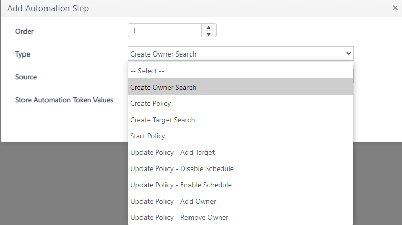 Select an automation step type from the drop-down list. The automation step types that are available are shown in the screenshot below. Our example shows creating an automation that will add new SharePoint Data Target searches using the type ‘Create Target Search’