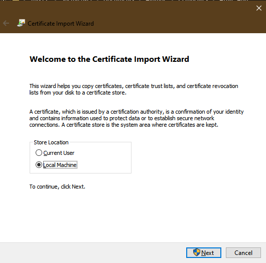 Begin by right-clicking the certificate .pfx file and either selecting 'Install PFX' or 'Open' from the context menu to launch the certificate import wizard. On the welcome screen select the Local Machine radio button then click Next: