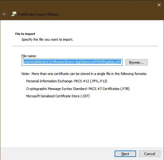 Use the Browse button to locate the certificate .pfx file, select the file then click the Next button to continue: