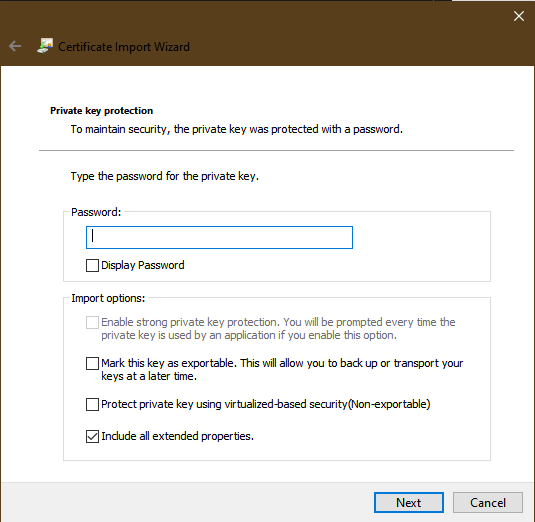 Enter the password used to generate the certificate, select the boxes shown below then click Next
