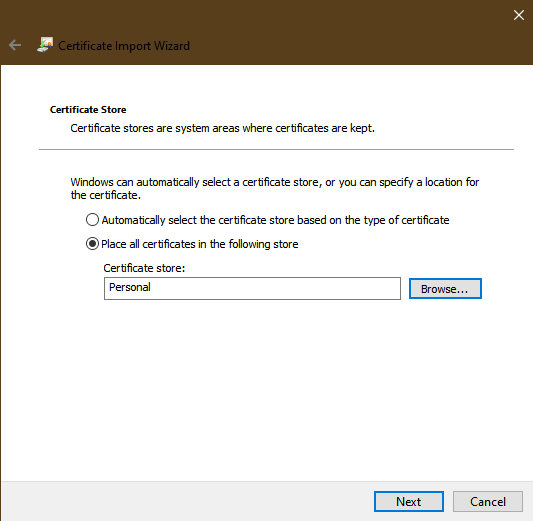 Select the radio button allowing you to select a certificate store, click the Browse button, select Personal then click the Next button: