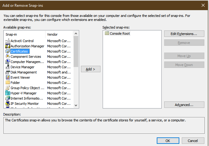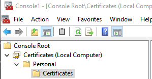 In the Select computer dialog, choose Local computer then click the Finish button. This will return you to the Add or Remove Snap-ins dialog, click OK to save your settings, and return to the MMC. There should now be an entry for Certificates (Local Computer) shown in the navigation tree. Select it to open the list, then select Personal, and Certificates.