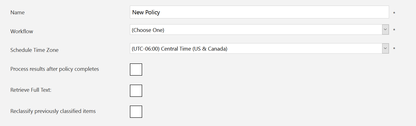Workflow - Select a workflow from the drop-down menu. Workflows define the core functionality of a policy. These are constructed either by using the wizard on the web or by using the Workflow Builder. Each data source type only has one workflow associated with it.