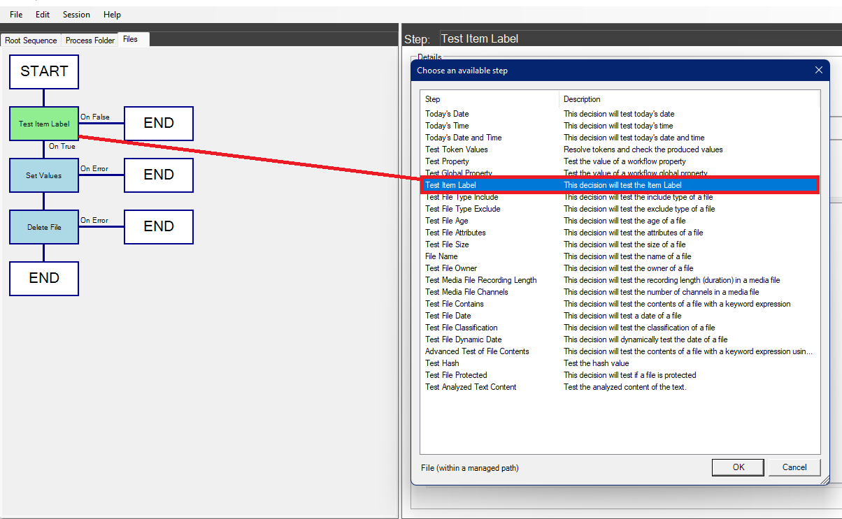 To interrogate the label value of each row on the report, this example workflow uses a decision step in the ‘Files’ sequence