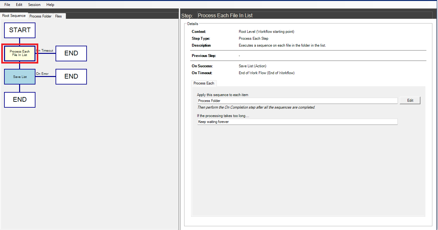 Important: Since these workflows will be applied to items on a Discover report, the root sequence of the workflow must contain a ‘process each item in list’ step for the type of content being managed.