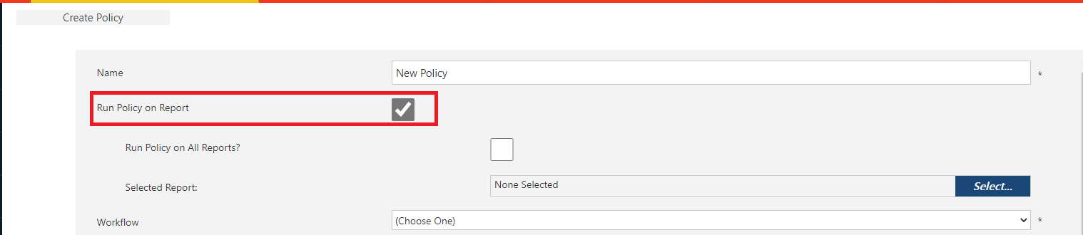In this workflow, when the value of the label is ‘delete item,’ the workflow will apply the delete action to remove the item that the Data Owner indicated. Data Owner workflows are executed by adding them to Data Governance policies. When creating the policy, select the check box ‘Run Policy on Report’.