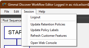 To apply the actions indicated by a Data Owner, administrators must create a workflow that will test the label value and then apply the appropriate action. The first step in this process is to update the Workflow Editor with any labels that have been defined in the Discover Settings area. From the top menu, select Session, then log in using a valid Discover user ID and password. Next, under the Session link, select the option to ‘Update Policy Labels’