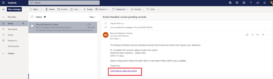 When the workflow has been configured to automatically notify Data Owners that they have items to review, they will receive a notification similar to the one shown below. That email will include a link directing them to the Discover User Portal. Clicking that link will open their default web browser, initiate an SSO login, and route them to the User Portal where they can review their content.