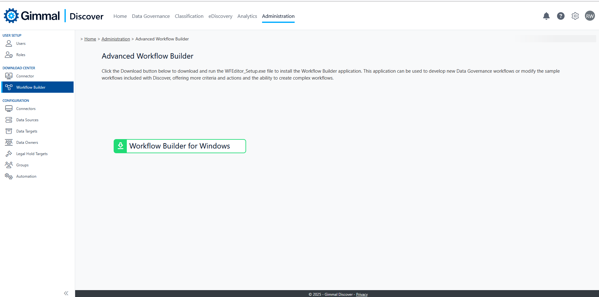 From the Download Center link on the left, you can also select the Workflow Builder. This link will lead you to the download page for Gimmal’s workflow builder desktop application. This tool may be used to create a new workflow or edit one of the sample workflows available in Discover. Workflows are an element of Data Governance that allows you to orchestrate a business process by specifying the decisions and actions to be taken on a specific content source. For more information, refer to the Workflow Builder section of the documentation.