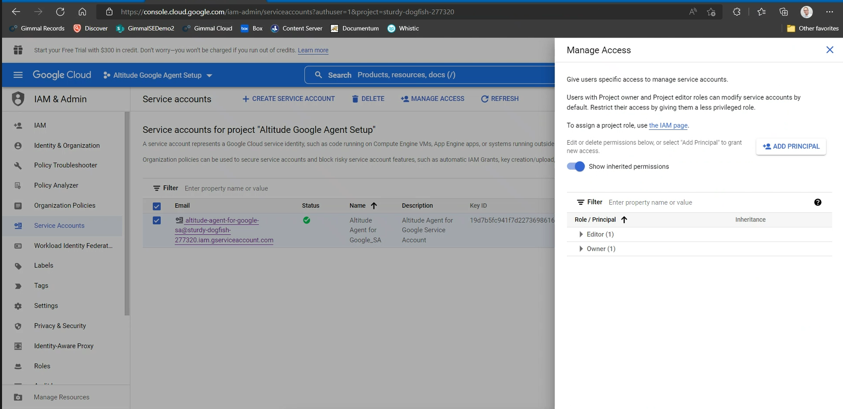 Inthe “Manage Access” pane and make sure the service account has the roles for Editor and Owner: