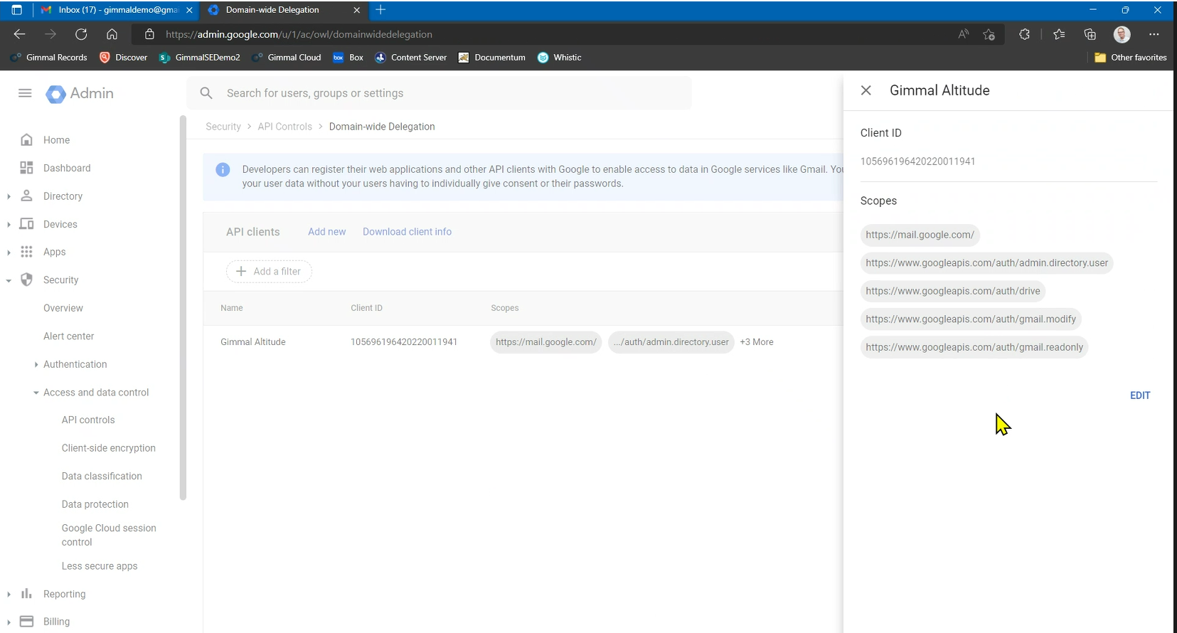 Make sure the Gimmal account you have created has all of the “Scope” entries shown below. If it does not, click the edit button to add any missing scope.