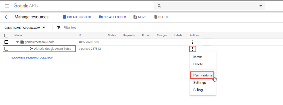 Make sure the Service Account used in the Google Agent configuration has 'Owner' rights to the newly created Google project. This is corrected by updating the following: