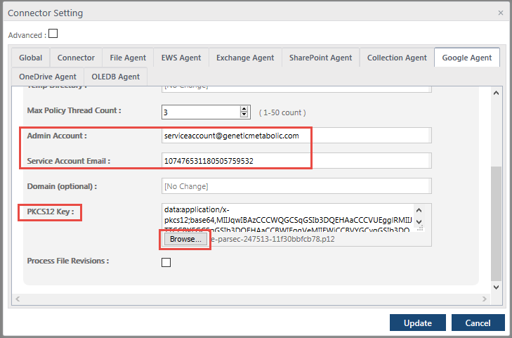 Click on the 'Google Agent' tab, then scroll down to where you will see the Admin account field. Enter the admin account created when the G Suite account was initially created, then paste the 'Client ID' into the 'Service Account Email' field. Next, click on the 'Browse' button to select the P12 file created in Step 15 of 'Section One'.