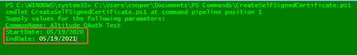 Press Enter to continue; the second and third prompts will be the Start and End (expiration) dates of the certificate