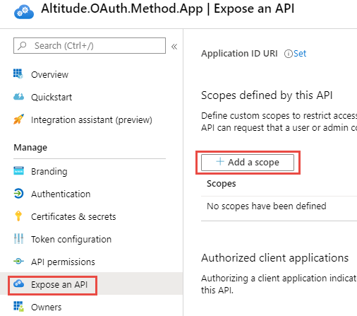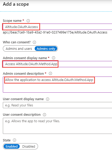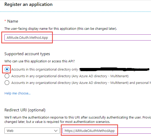 Fill out the Name and Redirect URI fields as shown in the example below (the user-facing display name Altitude.OAuth.Method.App shown below is an example)
