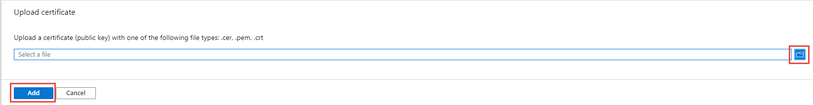 Certificates & secrets - click the 'Upload certificate' button, then navigate to the folder path where the certificate created in Step 1 of this document is stored (look for the file with a .cer extension). Click the Add button to continue: