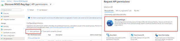 Select Quickstart in the navigation pane, then click on Add Permission. Locate Microsoft Graph in the Microsoft API's section of the list and select it