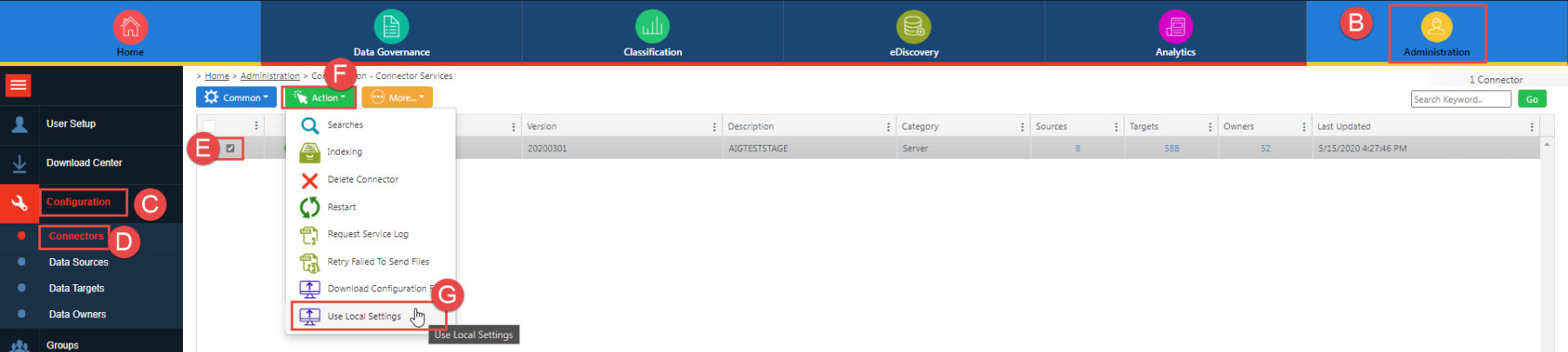 To enable OAuth for the MIcrosoft Graph Agent, existing customers need to convert their Connector and Agents to use the 'Use Local Settings' configuration file. This is taking all Username and Password-related entries from the Discover servers (removing the fields) and adding them to the Credentials.config file located in the $Sherpa Software folder on the Connector machine. To update the Connector/Agents please perform the following steps outlined below, each letter corresponds to an area shown in the diagram: