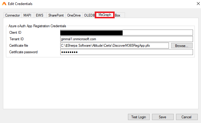 MSGraph requires an Azure Client ID and Tenant ID. To add the Certificate File, click on the browse button to navigate to the folder path where it is stored. Please note that this cert file has an extension of (.pfx), NOT (.cer). Lastly, please enter the password that was assigned to the certificate at the time of creation and click SAVE to exit the window.