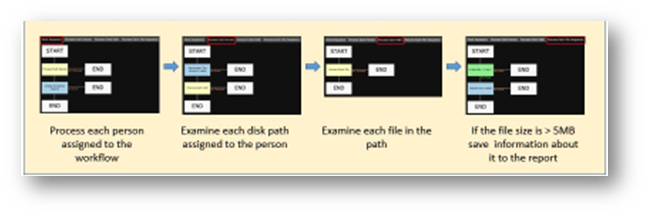 Discover policies utilize workflows to map out the sequence of steps that will take place when a policy is executed. Workflows are developed using either the simplified web editor or a desktop application called the Workflow Editor which is available from the Discover download center. This editor provides a flowchart-like interface for designing complex workflows. The diagram below shows the web view of a workflow that is designed to create an inventory report of files exceeding 5 MB in size.