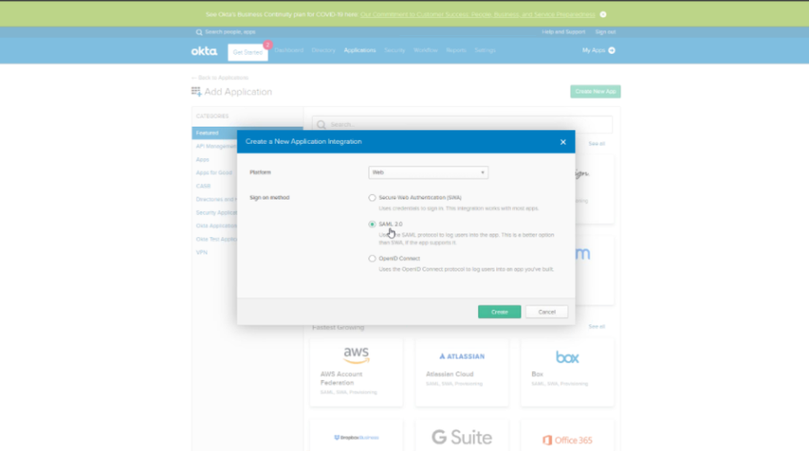 On the new application screen, select web from the platform drop-down box, then select the radio button for SAML 2.0