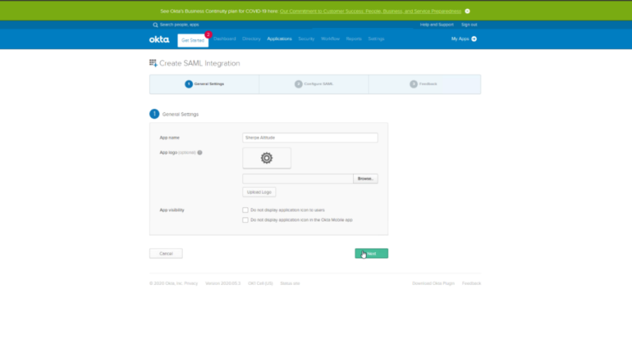 Begin by logging into the Okta administrative portal, selecting the Applications link on the top menu bar, then clicking on the button labeled Create New App.