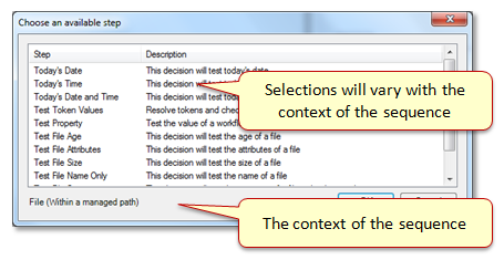 The list of available decision steps will vary by the context of the sequence that will contain the step. The following is a breakdown of these steps by context: