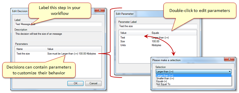 Workflows contain one or more sequences and sequences contain steps. A decision step evaluates some sort of condition, typically within the context of that sequence. Depending on the result of the evaluation, the flow of execution continues down one of two paths (True or False).