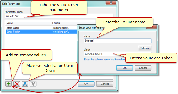 The other parameter to set at the Set Values step is "Value to Set". "Value to Set" is where the value of a column is set. In most cases this will be set to the value returned by a token, however the value does not have to be a token. For example one can just report the same static value, or use the token %prop(???)% to pull a value from a previous Set Property actions.