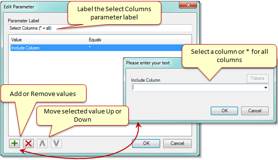 There are there parameters used to configure the Save List, Select List, Report Details, and Select Columns.