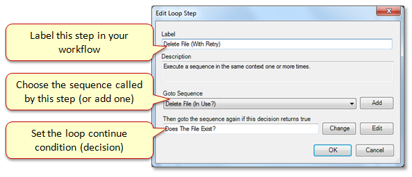 Workflows contain one or more sequences and sequences contain steps. Similar to the goto step, A loop step allows the execution of the workflow to jump to a sequence with the same context. Once the sequence ends a decision is used to determine whether to call the sequence again or to continue the flow of execution within this sequence. This step is used primarily to repeat the same logic until a condition is met.