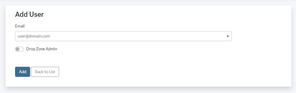 Begin typing the email of the user to be added. Select the correct user, then decide if the user should be a Gimmal Drop Zone Admin or not