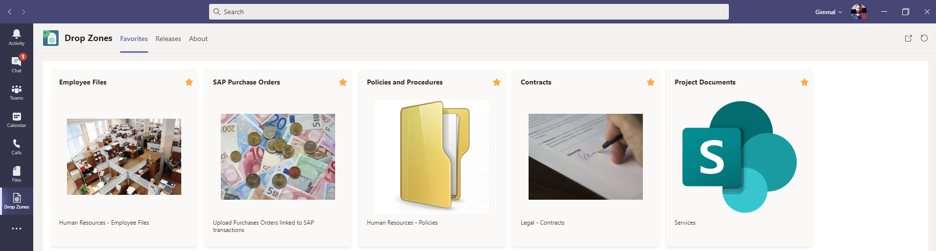 The Favorites tab displays a user's favorite Drop Zones. Users can select favorite Drop Zones from within the Gimmal Cloud for them to appear in Microsoft Teams!