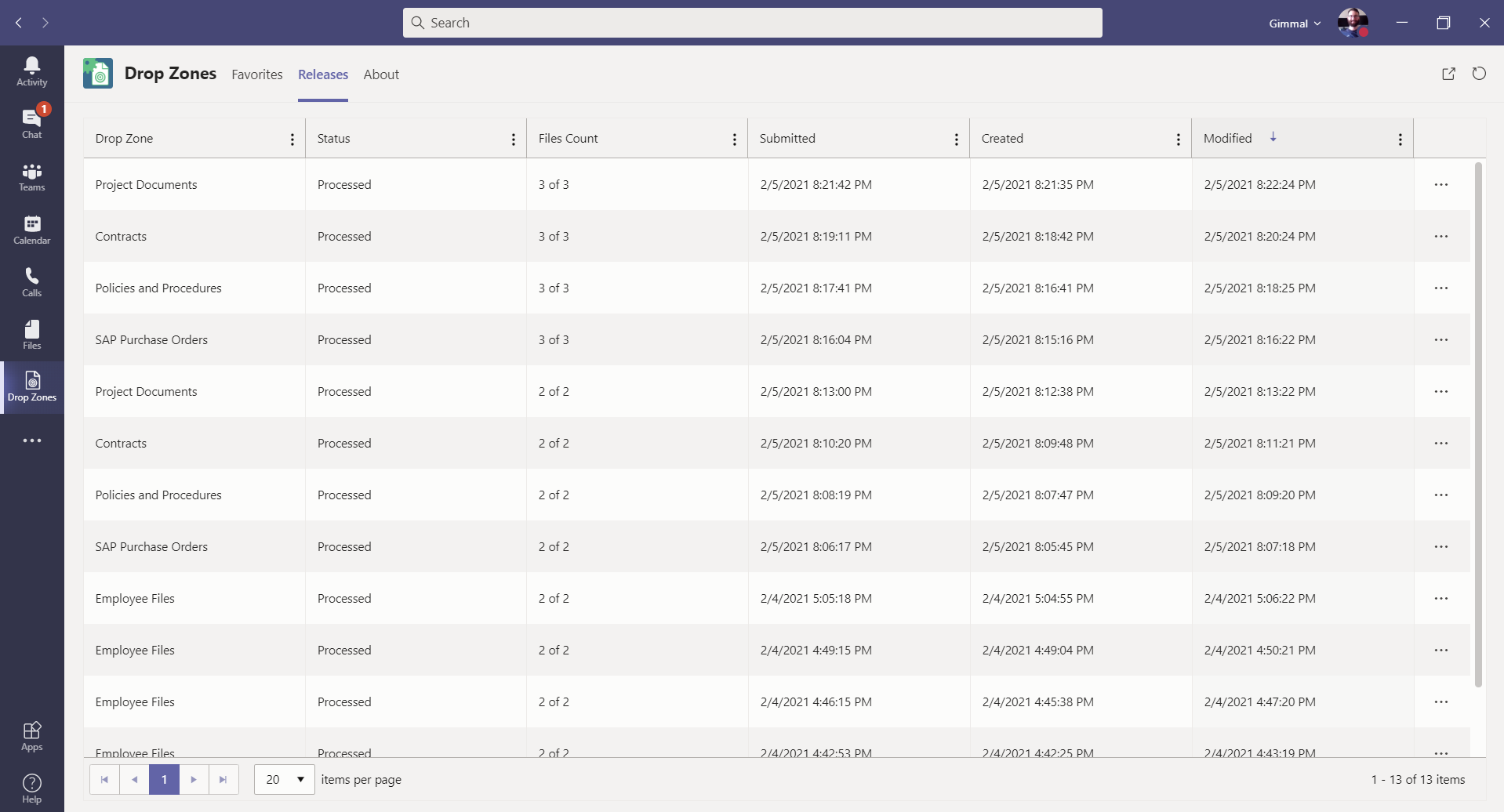The Releases tab displays a history of the user's content that was uploaded using a Gimmal Drop Zone. Users can view their release, file, Drop Zone, and template details from Microsoft Teams!