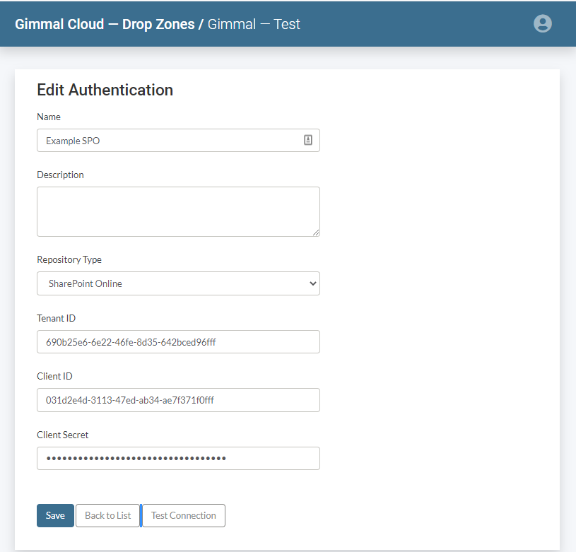The fields and actions are the same as described in Create New Authentication Settings except for Save which saves the changes for the current entry and returns to the list of entries.