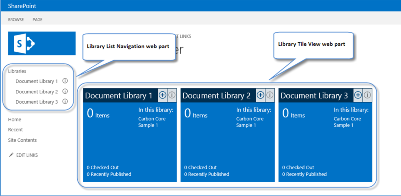 The Library Tile View and the Library List Navigation web parts (shown below) are added to the host site's web part gallery when you activated the Gimmal – Document Center feature during the installation process.