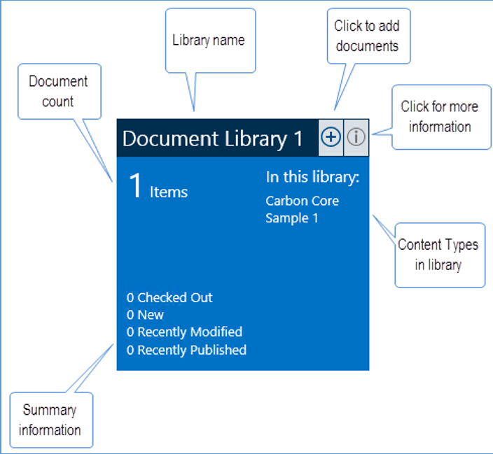 The Library Tile View web part displays useful information about a library's content, such as document count, content types in the library, checked out documents, and recently published document count. Refer to Configuring Document Center Web Parts for more information.
