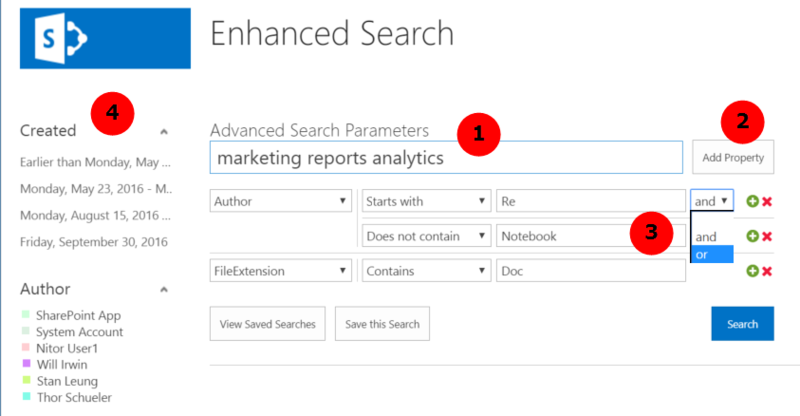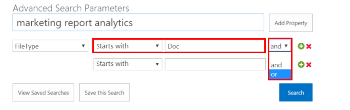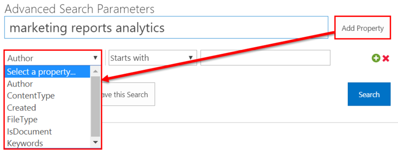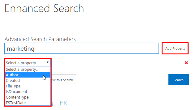 When the Enhanced Search administrator initially configured Enhanced Search, a number of queryable managed properties were specified to help you refine your search query. You can select one or more of these managed properties in the Advanced Search Parameters section so that you can apply additional parameters and operators to these properties to further refine your search. The managed properties are available from the "Add Property" drop-down list, as shown in the following figure. Depending on which property/properties you select, additional search parameters will display to the right of the property drop-down list.