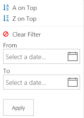 Filter search results | Click the drop-down arrow to the right of a column name. A filter dialog box displays (filter options will vary, depending on which column you choose to filter). Apply the filters as desired, and then click Apply. For a brief description of the above filters, see the following: