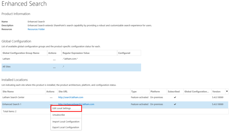3. In the Installed Locations section, click the Open menu (…) next to the site whose setting you want to edit, and then select Edit Local Settings. The Enhanced Search Edit Local Settings page displays.