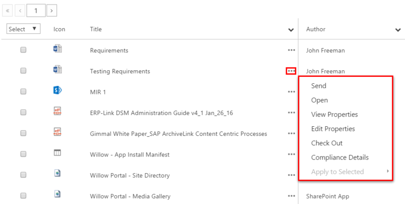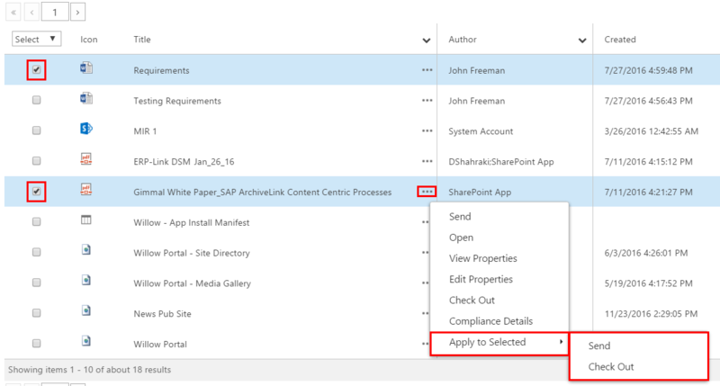 If you select multiple items and you click on one action in the main callout menu (e.g., Send, Open, View Properties, etc., as shown in the figure above) you will be performing a single action and you will be performing it on the single item whose ellipsis was clicked to open the callout menu (in the figure above, the action will be performed on the PDF item).