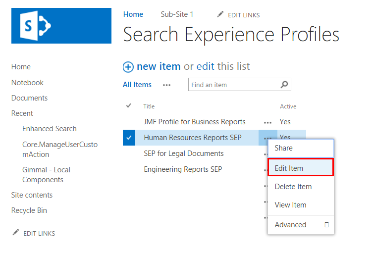 - On the Search Experience Profiles page, click the ellipsis (...) next to the SEP you want to edit or delete, and then click Edit or Delete Item.
