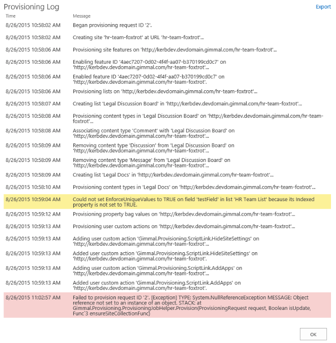 If any errors took place during this process, they display in the log in yellow, to indicate a warning, or in red, to indicate a failure in one or more of the processing steps. If you want to export the log file to send to Tech Support, for example, click the Export button and save a text file of the Provisioning log to your machine.