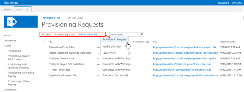 - Click Sites Provisioned to view all site collection/site requests that were provisioned successfully or successfully with warnings.