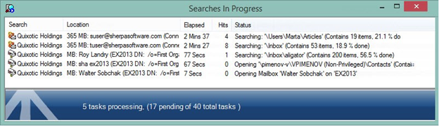 By default, five tasks are searched at once, but this number is customizable based on the power and RAM available on the local computer. As each task finishes, the next location in the queue will initialize.