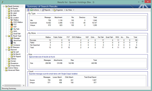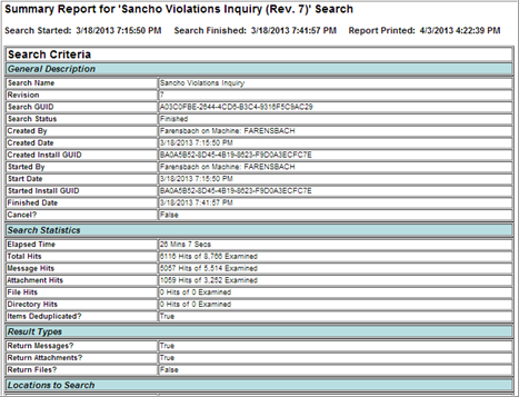 Discovery Attender has a number of reporting options available within the result management interface. These reports help provide chain of custody, audit trails, search statistics and item metadata. Reports are available in text, HTML and CSV formats. Detail reports are especially useful as they show all the relevant information (dates, original location, copy location, etc.) for each result item.
