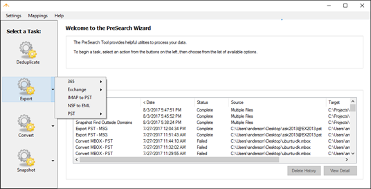- Export: Create PSTs or EML stores from data hosted in Exchange, IMAP (gmail, yahoo, Hotmail), NSF, Office 365 and more.
