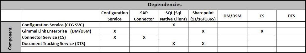 Each Gimmal Link component has dependencies that must be met in order to deploy the component properly. When you begin the installation process, refer to the following table to ensure that each product's dependencies have been addressed.