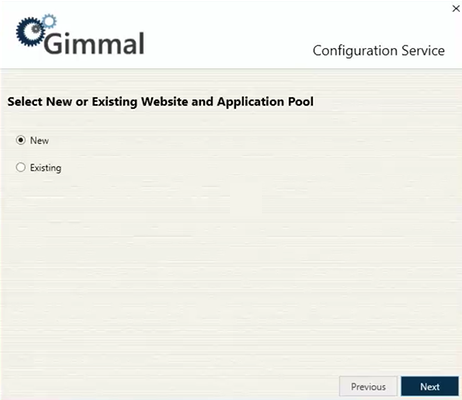Indicate if you will be installing the app to a new or existing website and application pool by selecting the appropriate radio button: New or Existing.