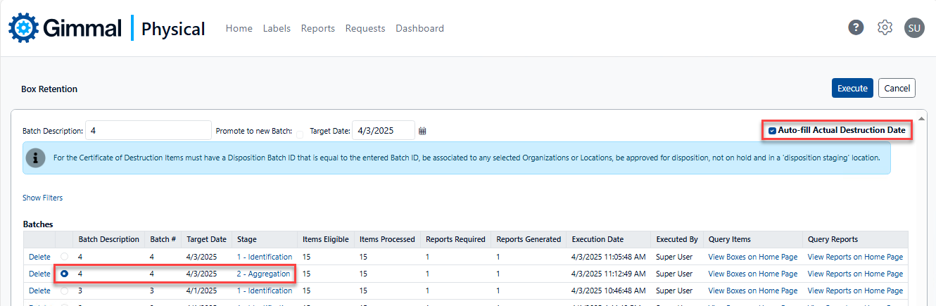 Select the radio button on the Aggregation Stage for the batch you wish to dispose of, then click the ‘Execute’ button to move to the Disposition Stage.